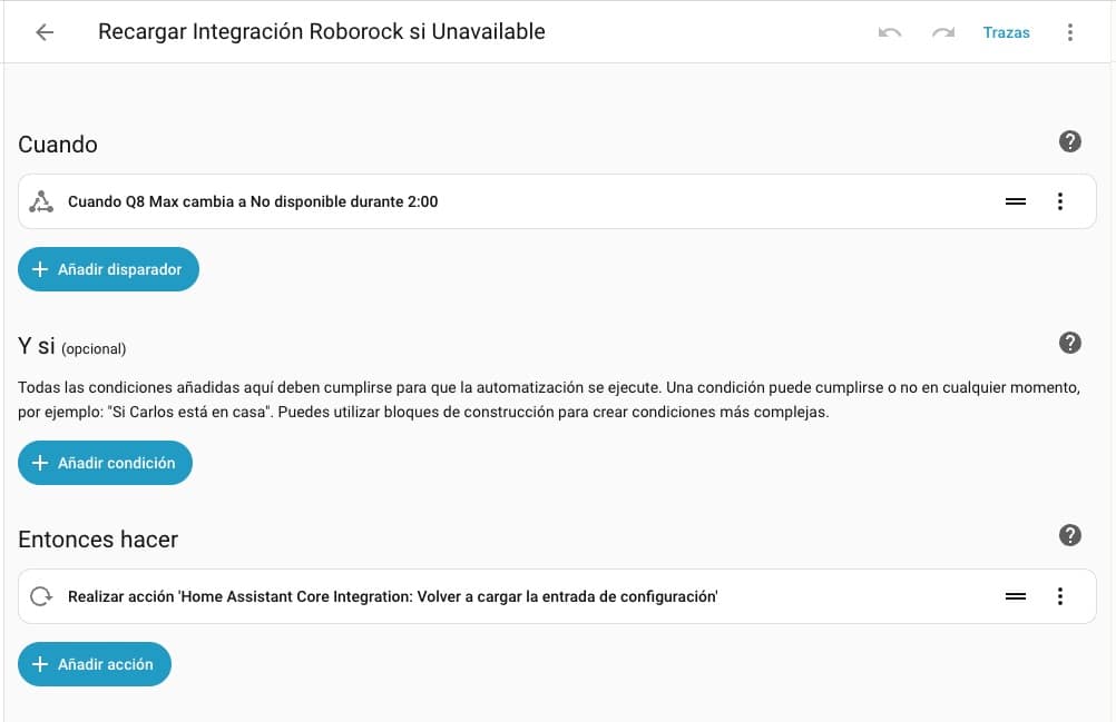 Con nuestra ñapa, en lugar de ir tú a mano a Configuración → Dispositivos y servicios → Integraciones y “Recargar” la de Roborock, es la propia automatización la que se reinicia cada vez que detecta que el robot ha pasado a estado Unavailable.