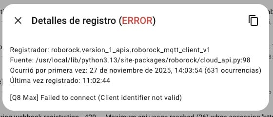 Como podemos ver, da un error de MQTT bastante feo: “Failed to connect (Client identifier not valid)” que además se ha repetido cientos de veces. Traducido a lenguaje humano significa que la integración de Home Assistant intenta conectarse a la nube de Roborock mediante MQTT y el servidor le responde que el identificador de cliente no es válido. Es decir, no es que el robot esté en ahorro de energía, es que los servidores de Roborock rechazan la conexión.
