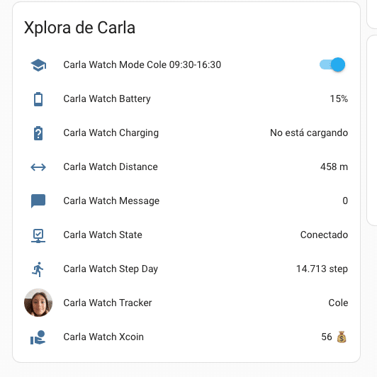 Existe una integración en HACS, ya sabéis, la tienda de complementos alternativos no oficiales de Home Assistant que, una vez instalada, nos permite hacer login en el portal de Xplora y acceder a los datos del reloj. No es una integración local, aquí ni MQTT ni tracker bluetooth ni leches, solo se conecta al dispositivo a través del servicio de Xplora, pero la verdad es que la integración funciona muy muy bien. Nos trae a Home Assistant toda la información del reloj, por lo que podemos ver la batería que le queda al dispositivo y que nos mande una alerta a nosotros si le queda poca batería tal y como hemos hablado ya alguna vez, os recuerdo que ya hablamos de la automatización para recibir una notificación cuando tenemos algún dispositivo con batería baja tanto en Home Assistant como en HomeKit, también podemos ver los pasos que ha hecho, si está en una zona segura o no y, lo que es más importante, la ubicación en la que se encuentra, con lo cual nos sale en la pestaña esa de Mapa de Home Assistant y podemos ver en tiempo real dónde está el dispositivo de nuestro hijo.